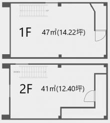 | 備考 | 1F=47㎡(14.22坪)・2F=41㎡(12.40坪) 分割相談可? 飲食業態はダクト上げ必須 |