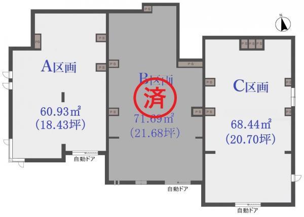 | 備考 | A区画も募集中! カフェ等の軽飲食のみ可。 スケルトン渡し(内壁ボード張り) |